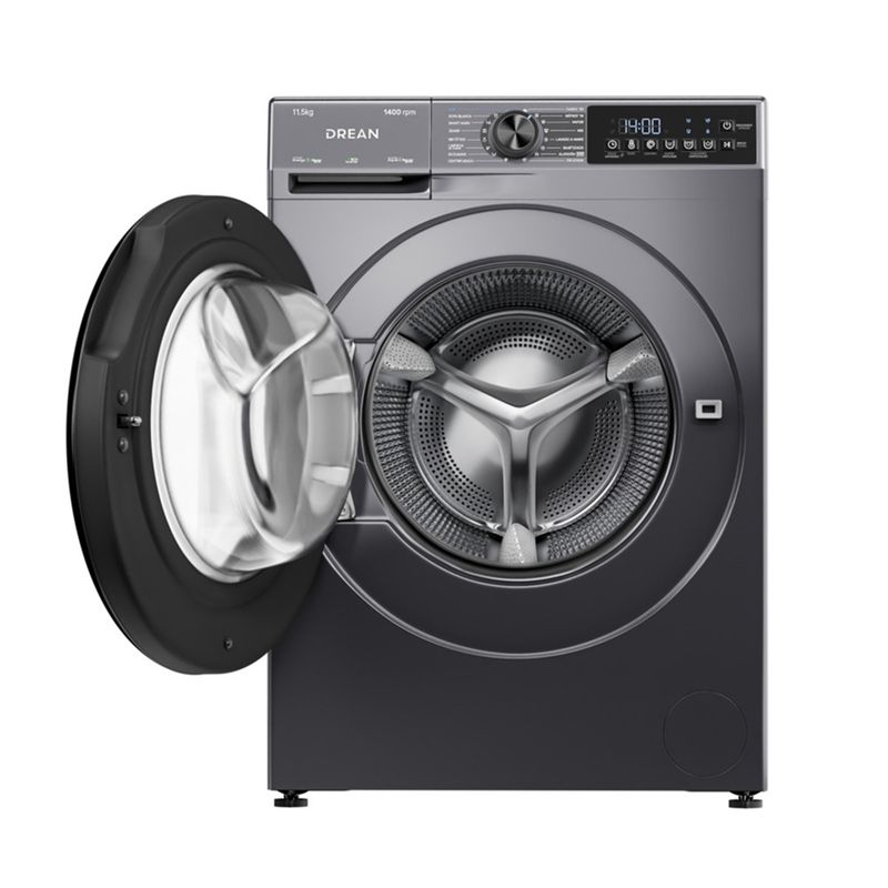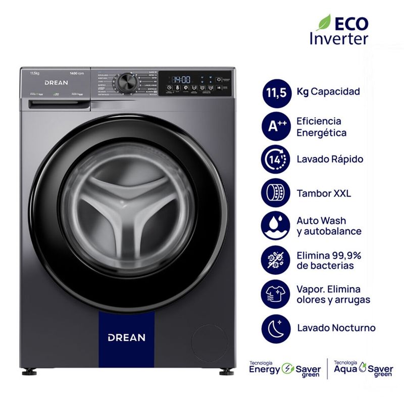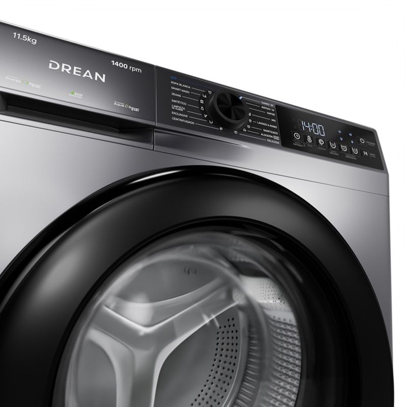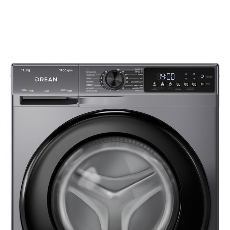 Lavarropas de carga frontal con tecnología Ecoinverter. Su capacidad de lavado es de 11,5 Kg y su velocidad de centrifugado regulable hasta 1400 RPM. Color gray. Eficiencia A++. Lavado europeo. 16 programas de lavado. Display LED y perilla. Carga autoadaptativa y función autobalance. Sus programas incluyen lavado rápido 14’ y 39’, ECO y Sanitizado. Lavado hasta 90°C. Opción antiarrugas, inicio diferido, super enjuague y lavado nocturno. Tambor de acero inoxidable XXL y puerta de vidrio.