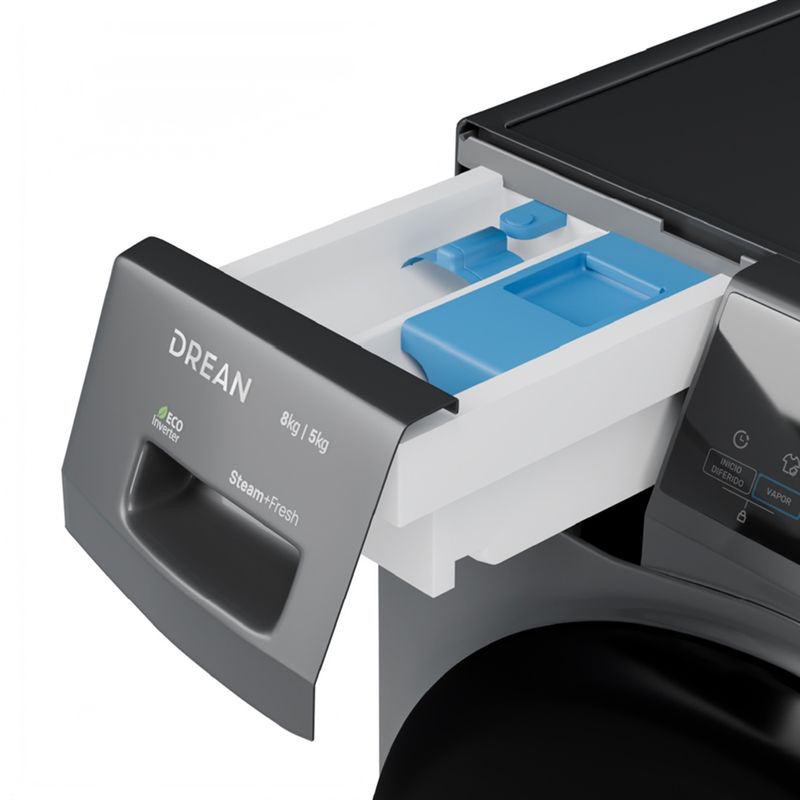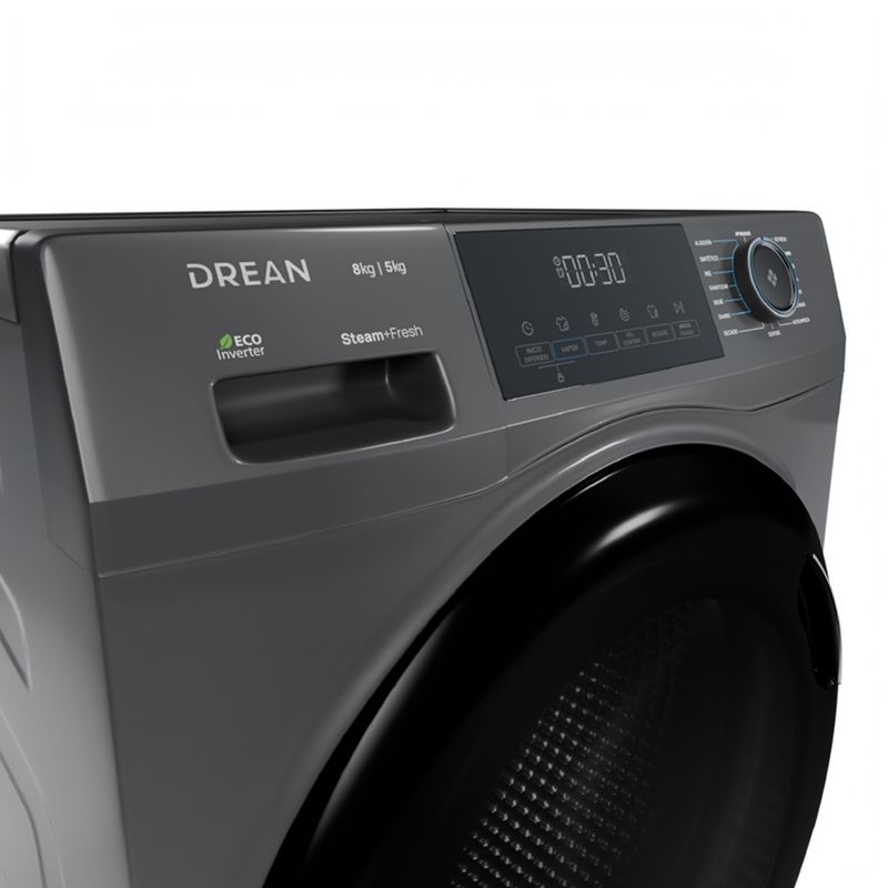 Lavasecarropas de carga frontal con tecnología Ecoinverter. Su capacidad de lavado es de 8 Kg y su capacidad de secado de 5 Kg. Color gris. Velocidad regulable hasta 1400 RPM. Cuenta con display LED y perilla bidireccional con bloqueo para niños y selector de temperatura. Posee 15 programas de lavado entre ellos acolchado y rápido 15'. El tambor es de acero inoxidable con tecnología Pillow Drum. Incluye alarma fin de lavado, función antiarrugas, extra enjuague y autolimpieza.
