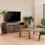 Por su media altura y su estante abierto del largo de la tapa, es visualmente liviano. Pero, a su vez, cuenta con una gran superficie para un televisor, espacio para ubicar artefactos electrónicos o libros, y dos puertas y cajones en el centro con mucho espacio de almacenaje.