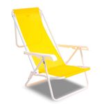 Reposera apoya brazo plástico de ocho posiciones, su cobertura es con telas recubiertas en PVC "solwind" varios colores, construida con tubos de acero de 3/4". Con soporte de apoyo en el respaldo para ser utilizado en su última posición.