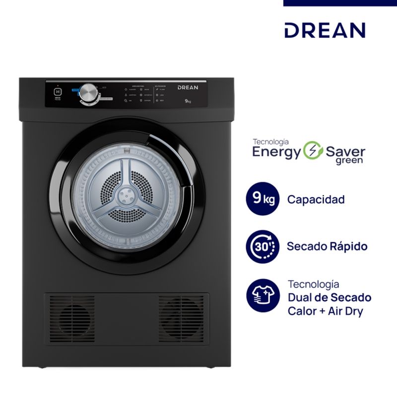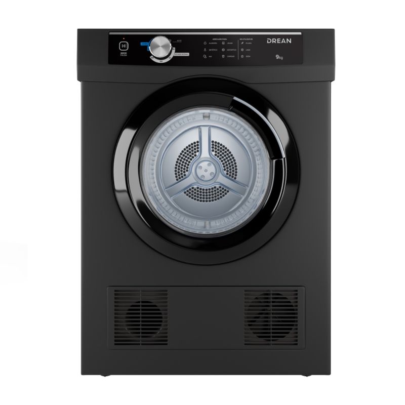 Secarropas por calor de carga frontal. Color gris. Capacidad de secado de 9 Kg. Tambor interior de acero inoxidable. Programas Air dry de 30 y 60’ con aire fresco, programa Auto que detecta los niveles de humedad en la ropa y detiene el proceso cuando las prendas están secas, y programas de secado por calor de 30, 60, 120 y 180’. Display LED con protección conformal coating y perilla. Tecnología Antiarrugas. Sistema de instalación dual con opción de salida de aire al exterior. Origen China.